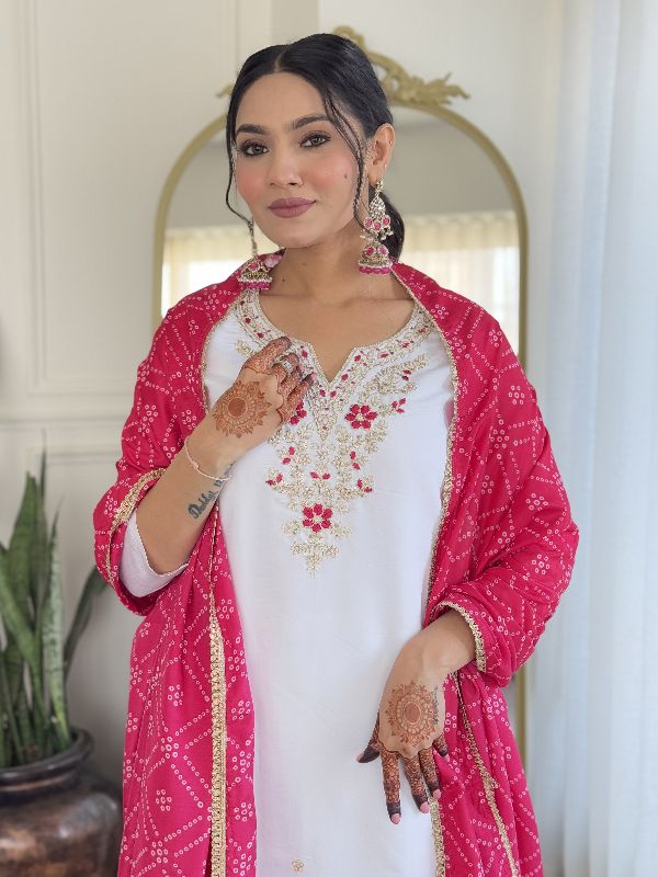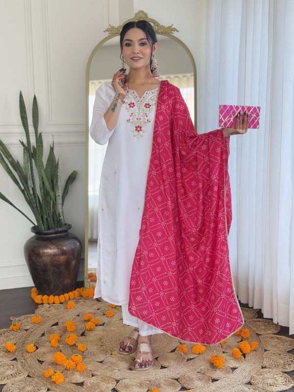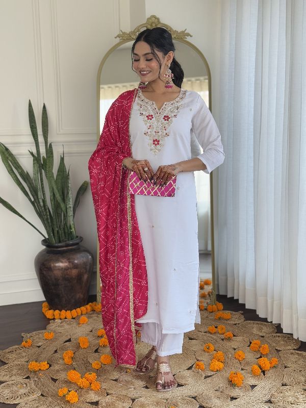We are a leading Manufacturer, Exporter, and Supplier of this exquisite Ladies White BSY Viscose Embroidered Kurta, Pant, and Dupatta Set, proudly made in India. This set includes a white and dark pink straight kurta in size S, crafted from high-quality BSY Viscose with full inner lining and intricate embroidery work. The set also features a luxurious silk blend dupatta measuring 2.10 meters in length. Elevate your style with this elegant ensemble that exudes grace and sophistication.